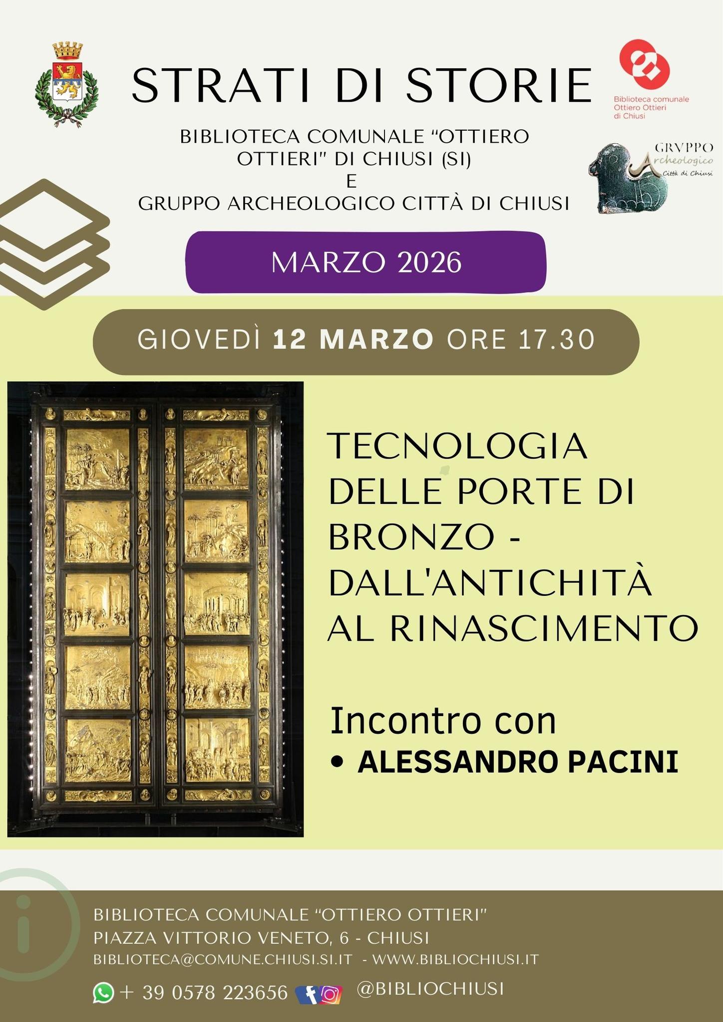 Giovedì 12 marzo, presso la Biblioteca Comunale di Chiusi, Alessandro Pacini illustra i contenuti del suo volume Passeggiate nell'orto metallurgico. L'incontro approfondisce l'evoluzione delle tecniche di fusione e lavorazione del bronzo, con un focus specifico sulla storia delle grandi porte bronzee dall'epoca antica fino alla maestria rinascimentale. Un'analisi che unisce archeologia, storia dell'arte e scienza dei materiali.