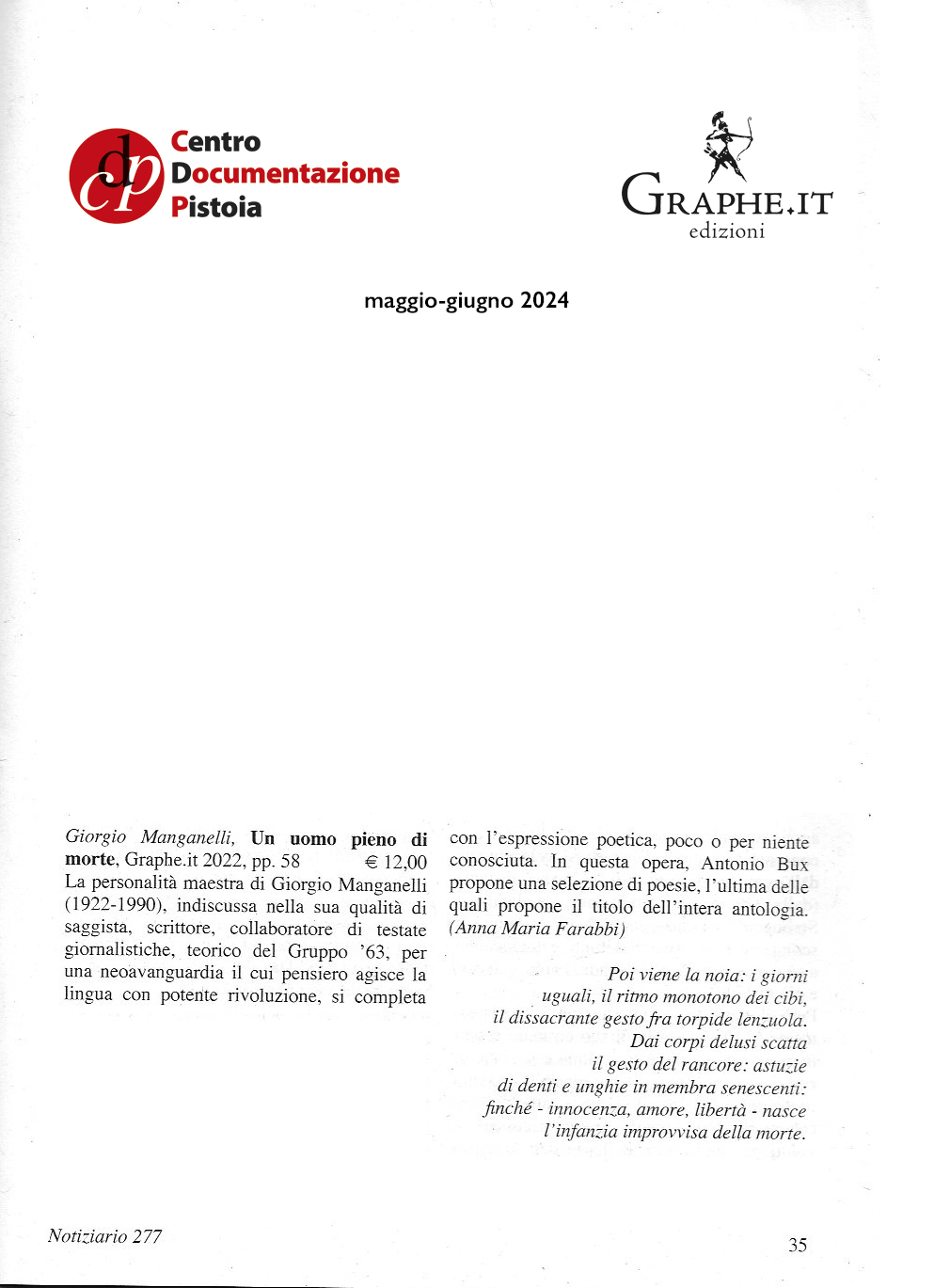 Una sorta di compendio poetico sull’esistenza e sulla sua aberrazione, che fin dal titolo (Un uomo pieno di morte) fa intendere quanto la poesia per Manganelli sia stata non solo la musa iniziatica di tutta una folgorante esperienza artistica, ma anche il rifugio stesso dalla morte e dalla sua continua compulsione alla fine.