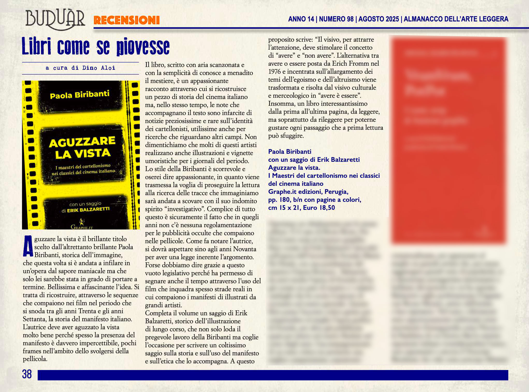 Aguzzare la vista di Paola Biribanti è un'opera che svela i tesori nascosti nei classici del cinema italiano. Attraverso un meticoloso lavoro di ricerca, l'autrice ha individuato i manifesti pubblicitari d'autore che compaiono nei film storici italiani, creando un ponte straordinario tra cinema e arte cartellonistica.